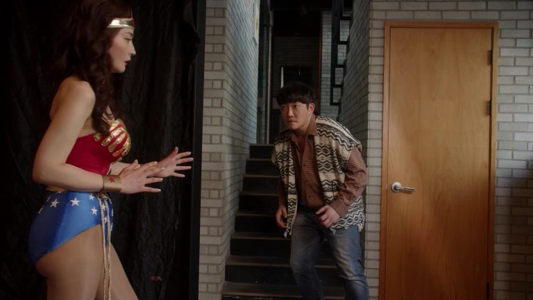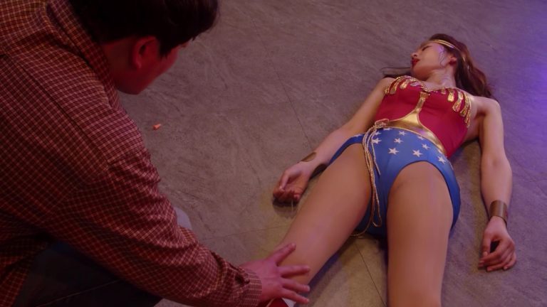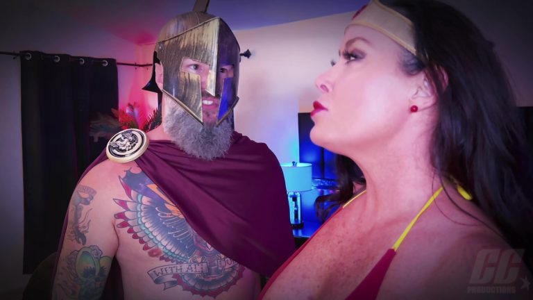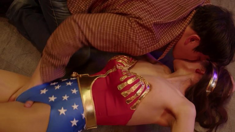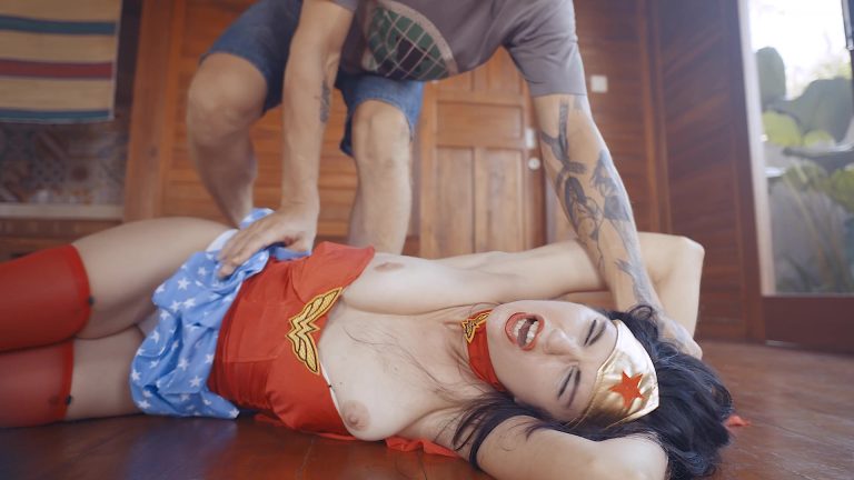 The superheroine mockingly and self-confidently reminds the masked man what he wanted to do to her and attacks the coward. They fight. Suddenly, the man hits Wonder Woman hard in the pussy, causing her to bend over in pain. At that moment, he rips off her magic belt, which contains all her super powers. He roughly spanks the completely helpless Wonder Woman and drags her to the couch, pulling off her costume. The superheroine screams in horror that he has no right to do this to her! However, she has to obey and jump on his lap. The intruder pushes Wonder Woman. She backs away in horror, accepting her defeat and promising to never fight crime again if he lets her go.