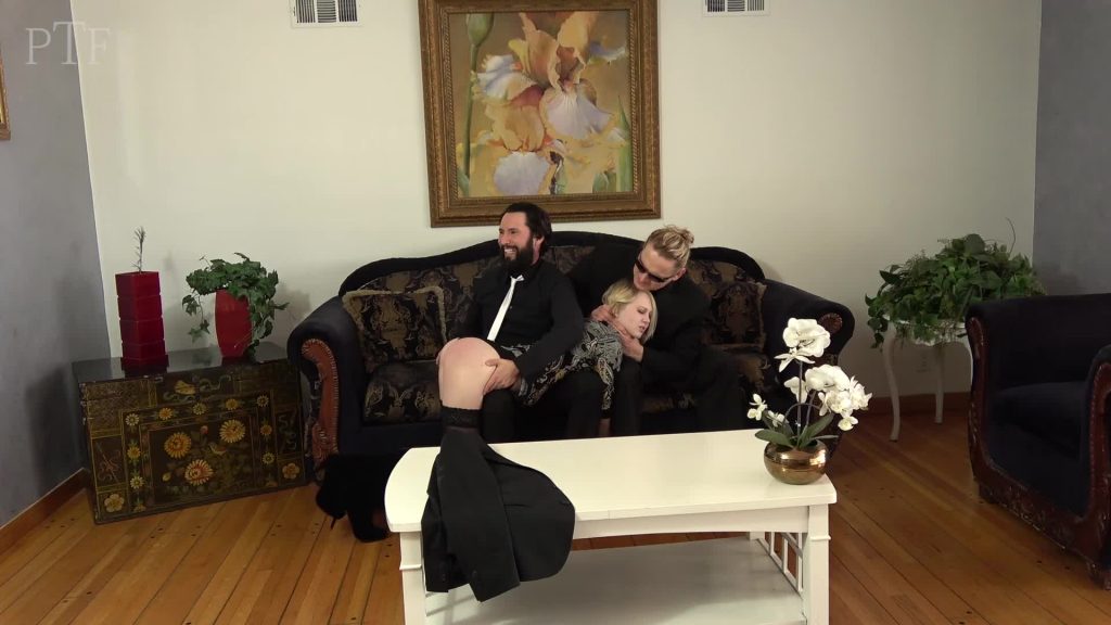 He put her over his knees and begins spanking her as she pleads for him to stop.