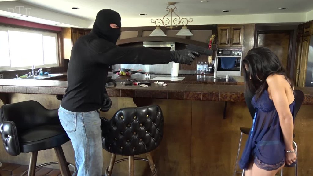 Prowler shoves the gun muzzle into woman back and tuck her as a hostage with him to kitchen find the money.