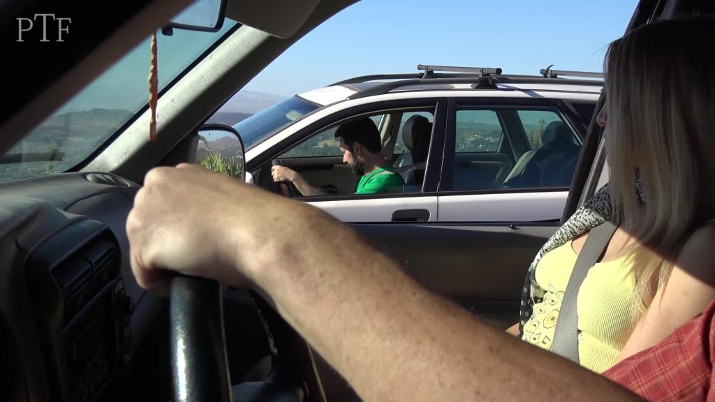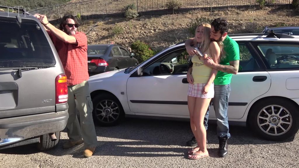 Now Tommy got mad. He had been on the way to his recovery meeting and this man made his blood boil.Tommy ordered the man’s daughter to get out of the car and handcuffed her dad to roof rag. After she had done it, he switched his gun for a knife and cut off the young girl’s clothes off. Then he ordered her to get on her knees and suck his dick in front of daddy as a humiliation and punishment.