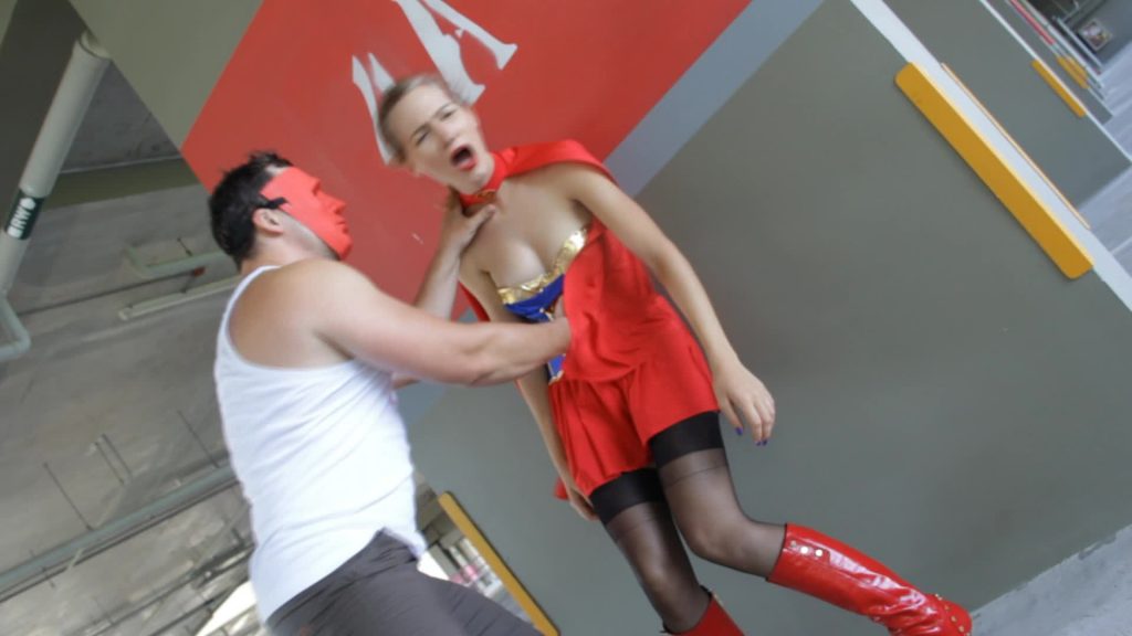 Judicator has been on the trail of intergalactic criminal Mal-Far and has tracked him to a remote primitive planet. Unfortunately, something causes her ship to malfunction; she barely survives the crash. But her communicator is malfunctioning, and she is unable to call for backup. On her own, Judicator explores the primitive planet. However, A Galactic Constable trained to overcome any and all obstacles to deliver justice, Judicator finally finds Mal-Far, cornering him in some type of crude temple. The villain lounges unconcerned. He mocks her ability to take him in, inviting her to join him and “go native.” Judicator grabs him by the throat and lifts him to his feet, she reminding him that she is 5x stronger than any man. At that moment, two chainmail-clad Amazons grab Judicator with inescapable iron grips. Mal-Far explains that the women of this world are 10x stronger than any man, making them twice as strong as she is. At the same time, being the only man on the planet has made him into a revered God for the desperate women. Mal-Far wants Judicator to be his slave as he has come to enjoy powerful women serving his every need. Judicator refuses and is dragged away by the Amazons to be brutally whipped into submission. Just before being shackled, Judicator nearly beaks free, using her Omni-bracelet to weaken and stun the amazons but she is quickly defeated with hard blows to the stomach. Judicator is restrained before the Amazons take turns whipping her into submission for their God.
