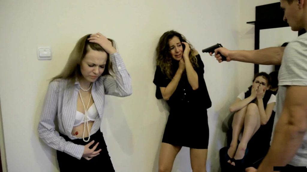 He enters the office where 3 young women are working – top manager, finance manager and young secretary. He shouts that he need the contract, then he orders women to stand near the wall and shoots them – one at the stomach, another – to the head and last girl in her hearth. You will listen their panic and begging crying, their pain and fear. When they all are dead he takes the contract and destroyes them. He stripes bodies and put them into the bodypile.