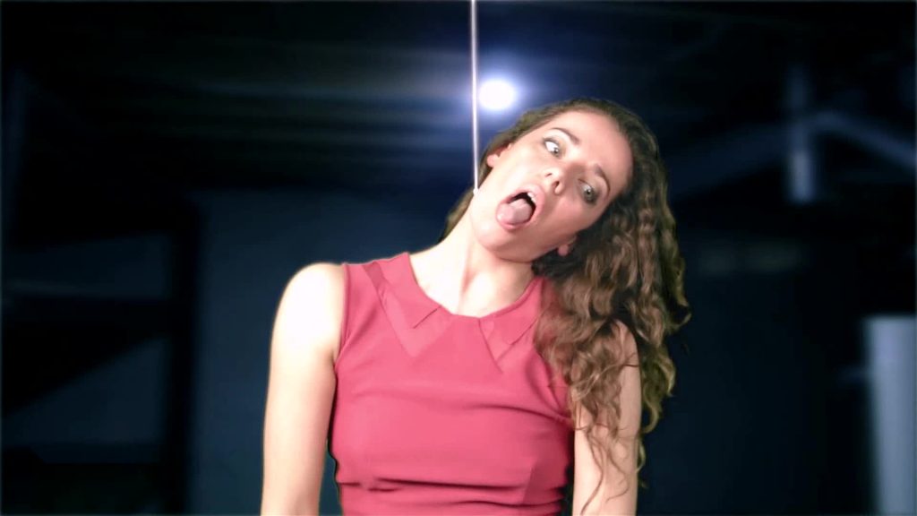 His second victim was 28 y/o Julia. She was a wedding guest and she was going to his friends numbers. Married, with children, young mum, she was attacked by maniac. He strangled her very brutally. Her reaction is great, she does super sexy kicking legs show and funny face agony with her tongue out. Dead! He took off her sexy red dress and put her body nearVika’s corpse.