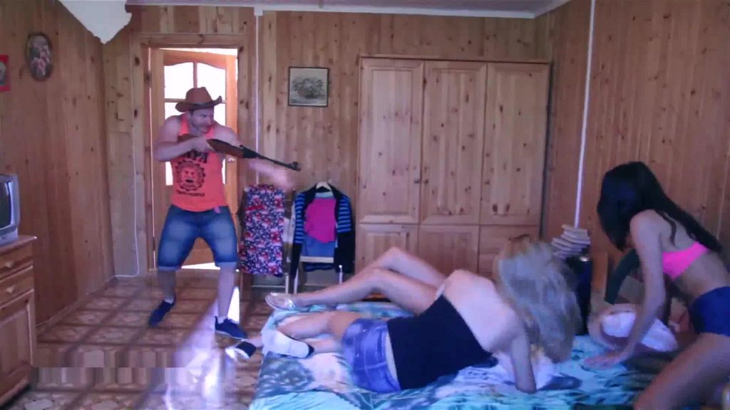 The girls come to the house. They are happy because of great summer weekend.  They laugh and have fun but all changes when crazy house-owner rushes to the room with a gun. He surpsises them, kidnaps,  stands near the wall and bind their hands behind their backs. He takes a ruler, leans it to their asses, and measures the length of shorts. Too short! «Minx!»  – declares moralist. Then he scours their pockets. He finds cigarettes in Luiza’s pocket, condom in Angelina’s pocket, drugs in Marina’s pocket but he finds nothing in Tora’s pocket.