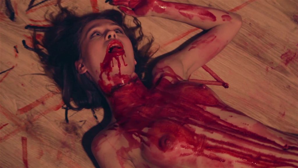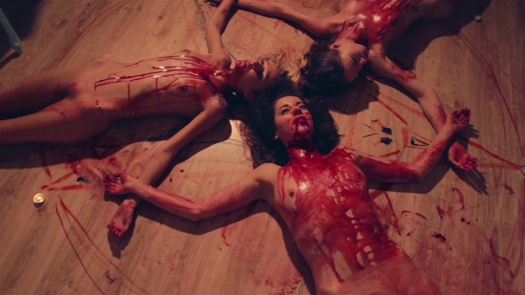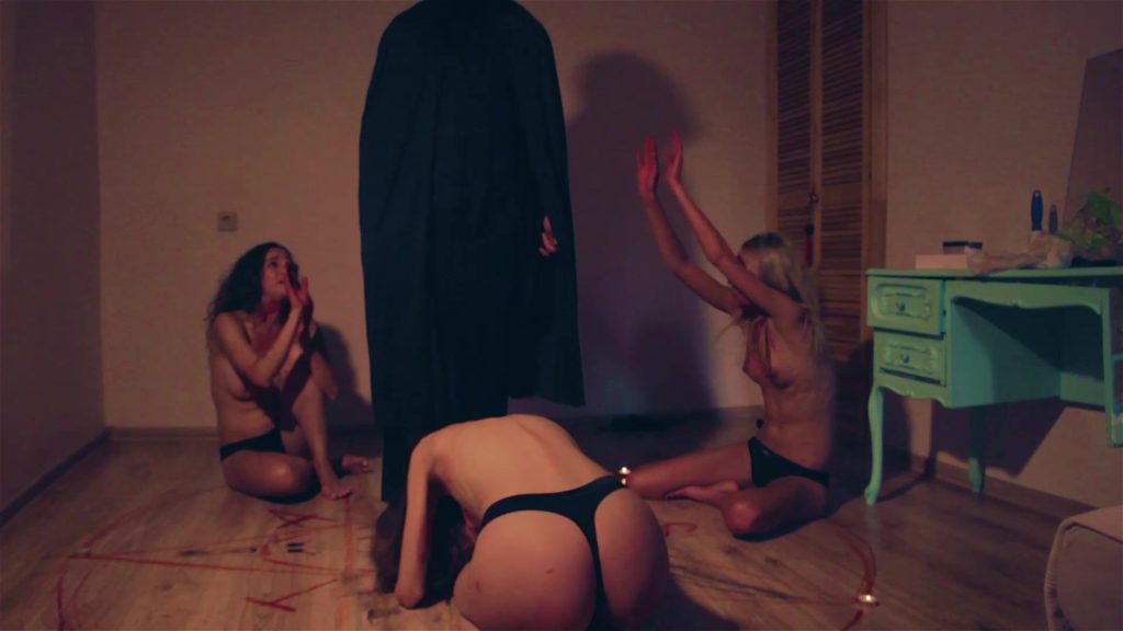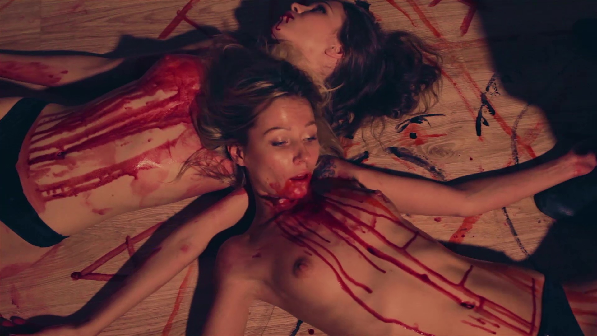 Three sister decide to play dangerous game and invite Satan to their house. They read in satanic book how to do it. They stripped topless, cut hands and slashed blood to their bodies. Their read special spell but did it incorrectly, so they called not Satan but Evil Spirit who slept all the time in their attic. The spirit of Demon came to them and cut their throated like pigs. It was too late to beg him leave them alone, too late. He killed them with a knife very brutal and stripped full nude to leave their nude bloody corpses on Devil Star.